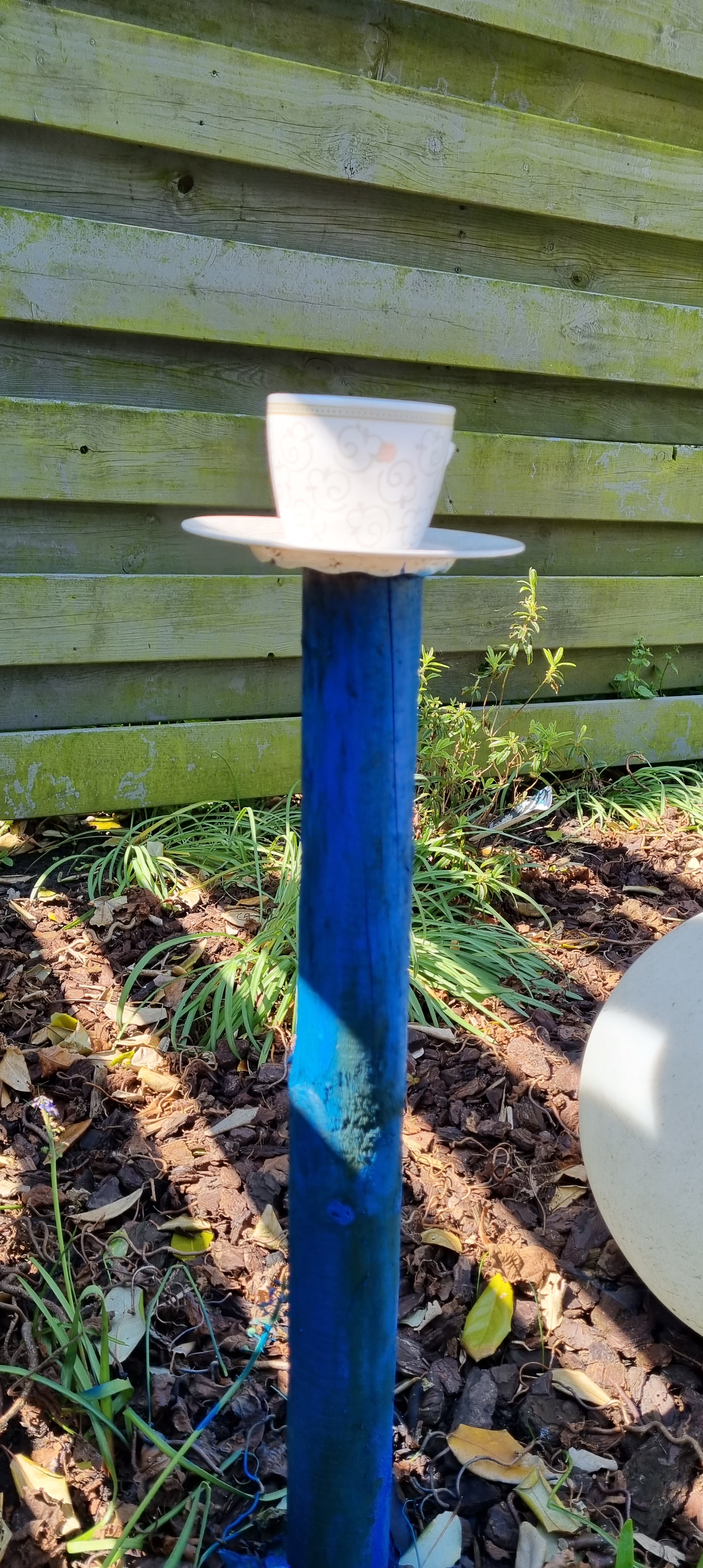 Terwijl ik hierover napraatte met mijn soulmate, kreeg ik een idee. Het liefst zou ik vele bomen in de wijde omtrek blauw verven. Heb het anders bedacht en inmiddels uitgevoerd. Vier paaltjes staan in mijn tuin, met daarop kop en schotels. Deze paaltjes heb ik blauw geverfd. Een iets andere kleur blauw, de symboliek vind ik belangrijker. De foto’s heb ik ook naar mijn soulmate gestuurd. En in gesprek met haar, was zij onder de indruk. You did it!!!!